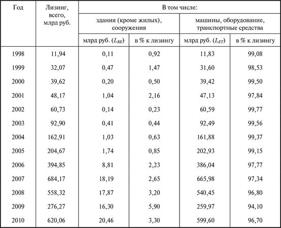 Проведенные вычисления по несложной методике с помощью данных табл. 3.3 и 3.4 показали, что удельный вес лизинга основного производственного капитала в общем объеме инвестиций в основной производственный капитал в 2007 г. составлял 12,7 %, а в 2010 г. – 8,4 %.