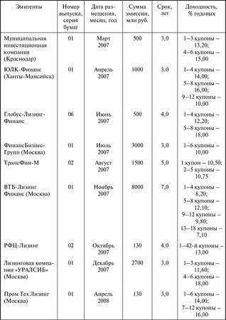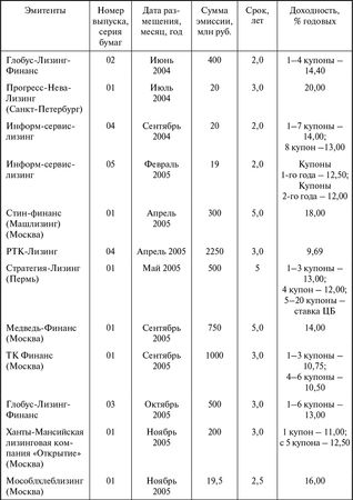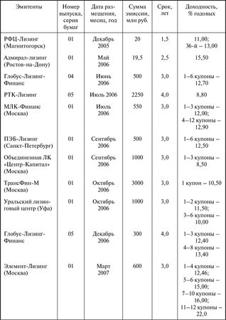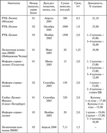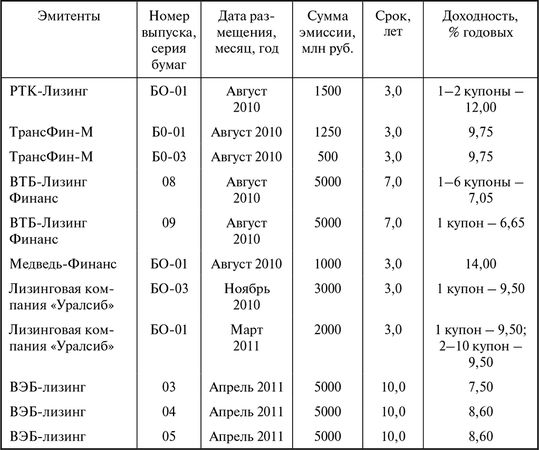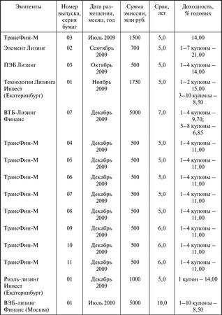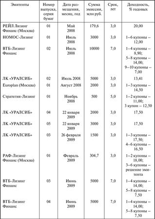 Одним из свидетельств начала процесса преодоления финансового кризиса в российской лизинговой индустрии явилась повышенная эмиссионная активность лизингодателей. Так, за период с середины 2009 г. до ноября 2010 г. десять компаний осуществили 22 выпуска корпоративных и биржевых облигаций на общую сумму 36700 млн руб., т. е. в пересчете более чем на 13 млрд долл.