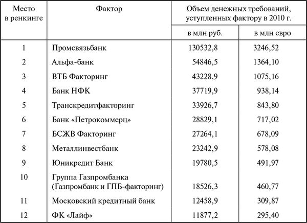 Вместе с тем лизинговая компания и сама может быть потребителем факторинговых услуг, которые оказывает фактор. По оценкам специалистов по факторингу в бывшем банке НИКойл, в 2000 г. оборот факторингового бизнеса России соответствовал 15 млн долл. Спустя несколько лет начался настоящий бум предложения факторинга в России. Чуть ли не каждую неделю запускались факторинговые программы в различных банках. Данные по росту факторинговых оборотов российского рынка в 2003–2009 гг. приведены в табл. 4.7 Наивысший результат был достигнут в 2008 г., когда Россия с показателем 16,15 млрд евро занимала 16-е место в мире. В период кризиса объемы сократились почти вдвое. Однако в 2010 г. отечественный рынок факторинговых услуг опять стал наращивать объемы и за год вышел на уровень почти в 500 млрд руб., т. е. прибавил 37,5 % [Волков, Мусиец, 2011], а в валюте соответствовал 12,43 млрд евро. Вместе с тем это значение уступает пока результатам 2007 и 2008 гг. Ренкинг агентства Эксперт РА с данными о крупнейших операторах на российском рынке факторинговых услуг представлен в табл. 4.8, в которой содержится информация о 12 из 26 факторах, участвовавших в обследовании.