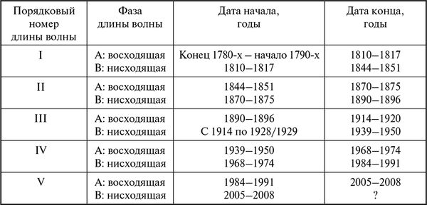Первая волна соответствовала изобретению паровой машины, развитию английской текстильной промышленности. Для второй волны характерным был расцвет металлургии, появление железнодорожного транспорта, развитие речного флота. Третья волна экономического подъема определенным образом была связана с химической промышленностью, автомобилестроением, развитием энергетики. Четвертая волна указывает на интенсивное развитие нефтехимической промышленности в мире, применение ЭВМ и систем программирования. Для пятой волны (конец XX столетия и начало XXI в.) характерным является использование современных информационных технологий, робототехники.