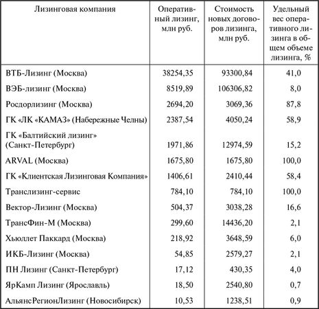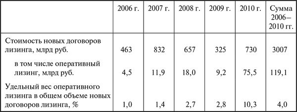 Примечательно, что специализированных компаний, деятельность которых в России нацелена на сделки только оперативного лизинга, насчитывалось совсем немного – всего по 3–5 компаний в год среди всех респондентов, участвовавших в наших проектах исследования лизингового рынка. Большинство лизингодателей, которые заключали договоры оперативного лизинга, – это компании, основной род деятельности которых в рассматриваемом периоде был финансовый лизинг.