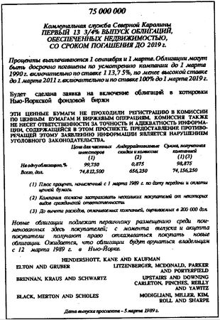 Компенсация инвестиционных банков. Чтобы проиллюстрировать получение компенсации инвестиционными банками, обратимся к конкретному примеру. На рис. 2.1 отражены особенности облигационного выпуска. Выпуск размещал синдикат, состоящий из восьми подписчиков во главе с инициатором размещения, банком Hendershott, Kane and Kaufman. Доля последнего в общем объеме размещения была наибольшей, 22,5 млн. дол. Доли остальных банков варьировали от 15 млн. дол. до 2 млн. дол. На рисунке мы видим, что синдикат купил облигации компании по цене 74 156 250 дол. за выпуск, или 988,75 дол. за одну облигацию. В свою очередь он установил продажную цену облигаций на уровне 997,50 дол. за одну облигацию, или 74 812 500 дол. за весь выпуск. Разница в 8,75 дол. в расчете на одну облигацию, или 656 250 дол. в общей стоимости выпуска представляет собой комиссионное вознаграждение синдиката за принятие на себя риска и всех остальных расходов по размещению выпуска.