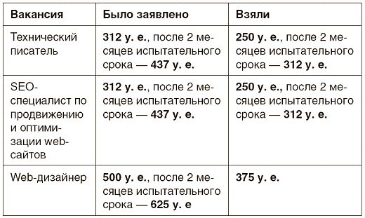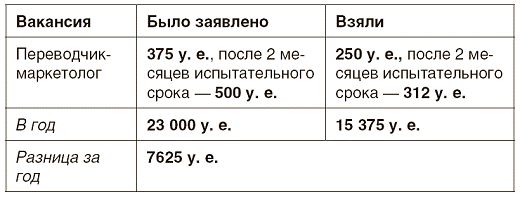 Путем нехитрых математических расчетов можно увидеть, что заказчик сэкономил на зарплатном фонде четырех (!) сотрудников 7,6 тыс. у. е. в год. И это буквально "на ровном месте", просто за счет здравого смысла и грамотного подхода к подбору персонала. Предполагаю, что вас интересует вопрос: а надолго ли задержались эти специалисты в данной фирме? Отвечаю: надолго. На момент написания данной книги прошло уже около трех лет, как этот проект был сдан, и до сих пор ни один человек не ушел из компании и не был уволен работодателем как профессионально непригодный. Думаю, этот факт говорит сам за себя.