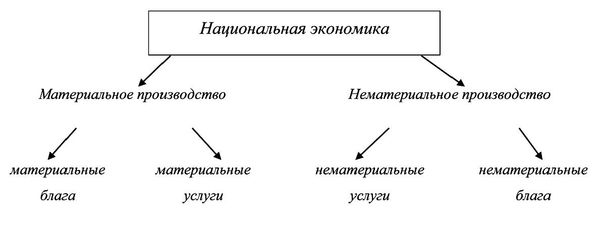 Национальную экономику подразделяют на две части: сферу материального производства и сферу нематериального производства. Материальное производство включает в себя производство материальных благ и производство материальных услуг. Материальные блага состоят из материально-вещественных факторов производства. Это сырье, энергия, здания, сооружения, машины, механизмы, приборы, инструменты, предметы личного потребления и т. д. К материальным услугам относятся услуги грузового транспорта, торговля, связь, ремонт и производственное обслуживание средств производства.