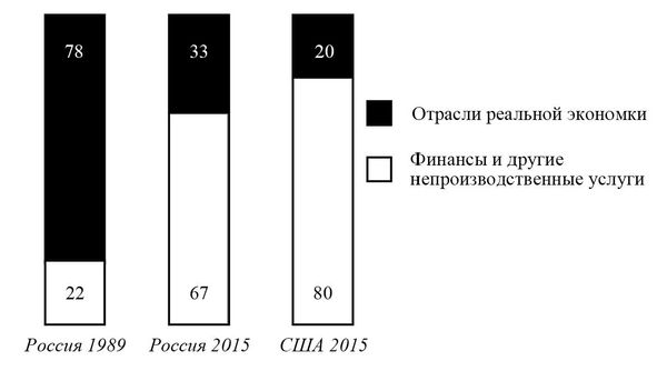 Теперь по такому пути идет и Россия. На долю сфер и отраслей, где добавленная стоимость вообще не создается, приходится 67 % ВВП.