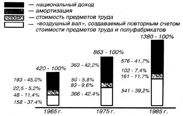 Показатель ВОП необходим для составления отраслевых и межотраслевых балансов. Но он не пригоден для измерения динамики объема производства и определения темпов экономического роста и повышения уровня производительности труда, так как в нем повторяется стоимость предметов труда. Как показано в диаграмме, предметы труда в 1965 г. составляли 11,4 и в 1985 г. – 11,7 %. А "воздушный вал" соответственно – 37,4 и 39,2 %. Это означает, что стоимость одних и тех же предметов труда повторяется в объеме валового общественного продукта в среднем почти четыре раза. К сожалению, несмотря на резкую критику ряда ученых и практиков, в советское время ВОП использовался в качестве главного показателя не только для измерения динамики макроэкономики, но и для оценки хозяйственной деятельности предприятий и министерств. В итоге на неуклонно возрастающий "воздушный вал" выделялся и реализовывался фонд заработной платы, а реальных товаров и услуг на соответствующую сумму не производилось. Это вело в конечном счете к дефициту на всё и вся и к разбалансированию народного хозяйства.