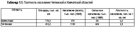 Да, населения в обеих областях мало, крайне мало. Плотность его очень низкая. Но Россия - вообще недонаселённая страна; это мы докажем ниже. Тем не менее в Забайкалье густота населения всё-таки повыше. Это особенно заметно при сравнении плотности сельского населения. В Читинской области она составляет 1,0 человека на 1 кв. км, а на Камчатке - лишь 0,3 человека.