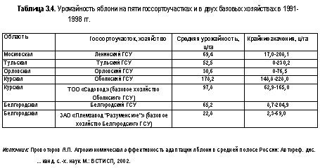 Урожайность яблони на сильнорослых подвоях от 52,5 до 69,4 ц/га при плохой агротехнике вполне возможна. Конечно, дело тут не в климате. Даже к северу от чернозёмной полосы при средней агротехнике урожайность яблони за многолетний период должна составлять порядка 85-105 ц/га (например, в совхозе "Большевик" Тульской области за 1981-1985 годы - 105,5 ц/га2, а в уже знакомом нам ОПК "Непецино" за 1997-2002 годы - 84,7 ц/га). А в чернозёмной полосе нормальный уровень урожаев при средней агротехнике - тот, который наблюдался на Обоян-ском ГСУ. Конечно, урожайность при средней агротехнике намного ниже биологической продуктивности яблони. На небольших делянках и в Подмосковье собирали урожаи до 800 ц/га3. Однако реальная урожайность нигде в мире не достигает уровня биологической продуктивности, в нашей стране тем более. А если уход за садом плох, то падение урожаев до 50-70 ц/га не слишком удивляет.