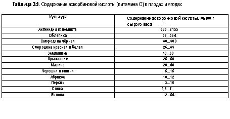 Роль аскорбиновой кислоты (витамина C) хорошо известна. Из следующей таблицы видно, насколько ягодные культуры превосходят плодовые деревья по содержанию этого необходимого для организма человека вещества.