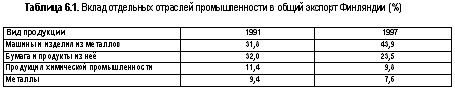 Откроем ежегодник International Trade Statistics Yearbook за 1997 год и выясним, какова структура экспорта Финляндии. Оказывается, продукция обрабатывающей промышленности составляет в финском экспорте 98,2%, продукция сельского хозяйства - 1,4%, а продукция добывающей промышленности - всего 0,4%. Ни о какой сырьевой ориентации экспорта у наших соседей нет и помину! А вот как менялась с 1991 по 1997 год доля отдельных отраслей в экспорте Финляндии.