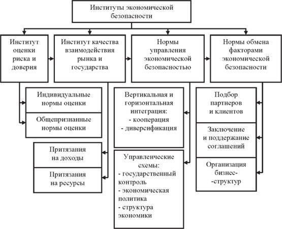 После выявления факторов экономической безопасности необходимо провести исследование институтов экономической безопасности (см. рис. 3.5), наиболее важными из которых являются институты рыночного и государственного управления экономикой.