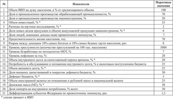 Из всего множества индикаторов уровня угроз экономической безопасности необходимо выделить те, которые отражают критические "болевые точки" в развитии экономики. Именно эти индикаторы используются в качестве пороговых значений экономической безопасности. Они характеризуют предельные значения, игнорирование которых препятствует нормальному развитию экономики и социальной сферы и приводит к формированию разрушительных тенденций в области производства и уровня жизни населения.