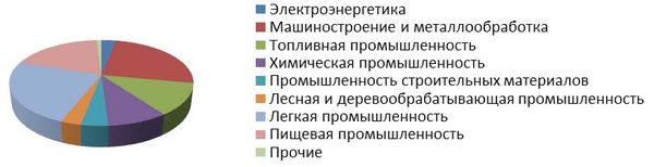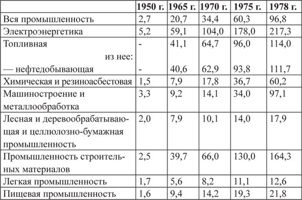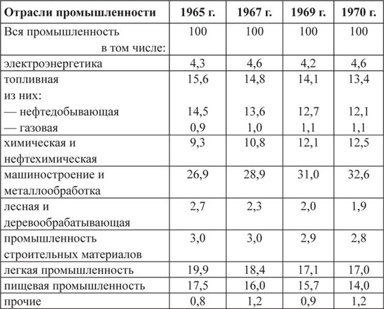 В 1960 г. на производство электроэнергии и теплоэнергии отводилось 2,6 %, на топливную промышленность – 11,5 % (из нее на нефтедобывающую отрасль – 10,9 %), на машиностроение и металлообработку – 25,7 %, химическую промышленность – 8,8 %, промышленность строительных материалов – 4,4 %, лесную и деревообрабатывающую промышленность 3,1 %, легкую промышленность – 24,4 %, пищевую промышленность – 18,8 %, прочие отрасли – 0,7 %.