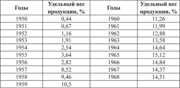 Таблица 1.7. Удельный вес продукции нефтедобывающей и газовой промышленности в общем выпуске валовой продукции с 1950 г. по 1968 г., в %