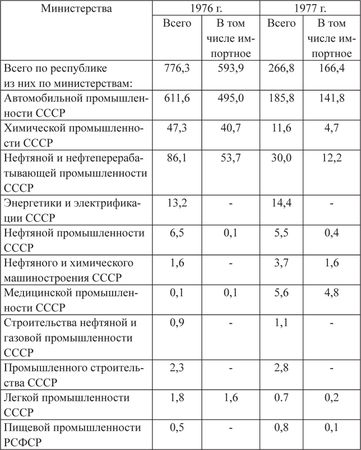 Даже имеющееся в наличии новое оборудование крайне медленно внедрялось в производственный процесс. Большая его часть, подлежащая установке, сдавалась в монтаж в течение года со времени его выпуска, 1/4 часть сдавалась в течение 2 лет, вместе с тем имелись случаи, когда оборудование залеживалось на складах 2–3 года и более. Такого рода оборудование в народном хозяйстве республики на период 1977 г. имелось на сумму 45 млн руб., в том числе оборудование на сумму 4,7 млн руб. не использовалось более 5 лет. Так, оборудование, подлежащее установке, на сумму более чем 35 млн руб. находилось на складах Нижнекамского нефтехимического комбината Миннефтехимпрома СССР, большая часть которого не использовалась с 1973 г., в то же время было и такое оборудование, которое лежало без движения 8-10 лет. На КамАЗе имелось подлежащее установке оборудование на сумму 184 млн руб., в том числе на 144 млн руб. (или на 79 %) импортное. Данное оборудование находилось на складах предприятия более 3 лет.