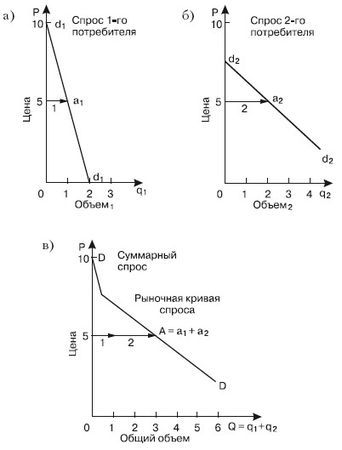 Кривая рыночного спроса, как правило, имеет меньший наклон в сравнении с кривыми индивидуального спроса, что означает, что при понижении цены блага объем рыночного спроса увеличивается в большей степени, чем объем спроса отдельного потребителя.