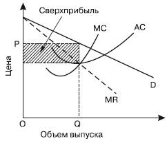 В коротком периоде в условиях монополистической конкуренции фирма, максимизирующая прибыль, будет стремиться осуществлять производство при такой комбинации цены (ОР) и объема выпуска (OQ), которая уравнивает предельные издержки (МС) и предельный доход (MR). В этом случае фирма может извлечь сверхприбыль (рис. 31.2).