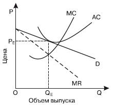 Фирма по-прежнему максимизирует прибыль при такой комбинации цены (ОРЕ) и объеме выпуска (OQ,E), когда предельные издержки равны предельному доходу. Однако в этом случае фирма извлекает лишь нормальную прибыль. Равновесие на уровне нормальной прибыли в долгом периоде аналогично равновесию фирмы при совершенной конкуренции с той разницей, что монополистическая конкуренция вызывает менее эффективную действенность рынка. В условиях монополистической конкуренции фирма выпускает меньше продукта и реализует его по более высокой цене в сравнении с совершенной конкуренцией. Поскольку кривая спроса имеет отрицательный наклон, то она касается долгосрочной кривой средних издержек слева от точки минимума последней. Следовательно, размер каждой фирмы меньше оптимального, вследствие чего на рынке образуется избыточная мощность.