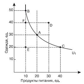 На рис. 8.1 на одной оси отложено число единиц одежды, на другой – число единиц продуктов питания. Соединив точки А, В, С, получим кривую U1; каждая точка которой показывает возможные комбинации единиц одежды и продуктов питания, дающие одинаковое удовлетворение. Кривая U1 называется кривой безразличия, которая указывает, что потребитель безразличен к этим трем наборам продуктов, т. е. потребитель не чувствует себя ни лучше, ни хуже, отказавшись от 10 единиц продуктов питания и получив 20 единиц одежды при перемещении от набора А к набору В. Точно так же потребитель одинаково ранжирует А и С, т. е. может отказаться от 10 единиц одежды, чтобы получить 20 единиц продуктов питания.