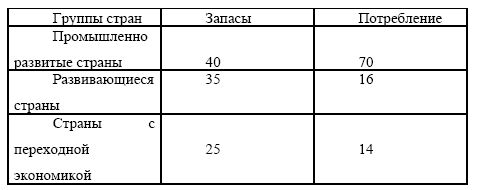 Природные ресурсы неравномерно распределены между странами. Лишь несколько стран имеют широкий спектр ресурсов: Россия, США, Канада, Китай, ЮАР, Австралия. В США сконцентрирована 20 % мировых ресурсов планеты, потребляют до 40 % мировых природных ресурсов. Западная Европа, Канада, Япония располагают вместе 20 % ресурсов и потребляют 30 % мировых природных ресурсов. Таким образом, на промышленно развитые страны приходится 40 % мировых запасов природных ресурсов, в то время как они потребляют 70 % (таблица 3). Развивающиеся страны обладают 35 % минеральных ресурсов мира и потребляют 16 %.
