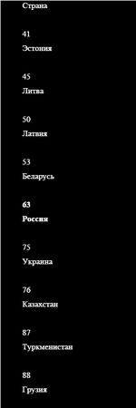 В первую пятерку вошли Швеция, Дания, Исландия, Южная Корея и Норвегия. Наименее развиты телекоммуникации в Мали, Буркина Фасо и Нигер. США заняли в рейтинге 11-е место, Япония - 15-е. Лучшей из среди постсоветских государств оказалась Эстония (29 позиция). Далее в перечне: Литва - 48, Латвия - 51, Россия - 64, Беларусь - 67, Украина - 89, Казахстан - 98, Туркменистан - 109, Грузия - 110, Молдова - 112, Кыргызстан - 118, Узбекистан - 119, Армения - 121, Азербайджан - 128 и Таджикистан - 130 [11] .