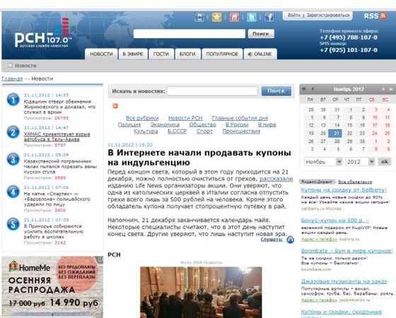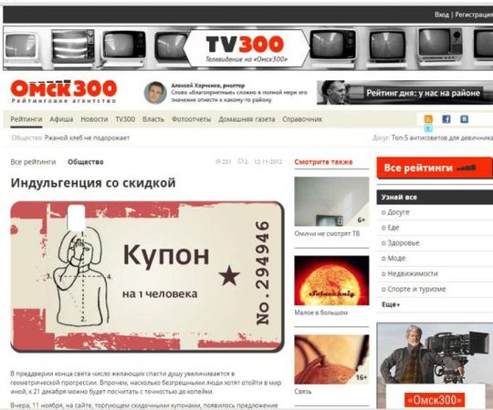 Да! Москва-24, потом 02-ТВ. Но, в принципе, по центральным каналам по всем новостям это прошло Сейчас если набрать "купоклуб. рф" в Яндексе, или просто "купоклуб" в новостях, там будет такое гигантское количество упоминаний. Если набрать "индульгенция со скидкой", будет в пять раз больше количество упоминаний. То есть, в принципе, акция состоялась благодаря чему? Естественно, все понятно, я все это рассказал…