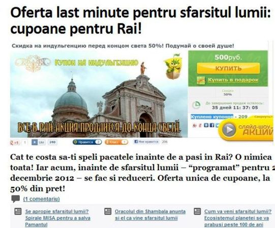 И, да, расскажу вам вещи, которые, собственно, получались у нас с индульгенцией, коротко пробежимся. Вот, допустим, наша индульгенция – новость номер один. То есть: сначала она вышла как купон, мы этого не учли, не упомянули нигде клиента. А потом пришла идея сделать логотип – там был дракончик, потом он стал везде фигурировать. Новость, первая страничка, куча публикаций: "Россияне хотят подготовиться к концу света", итальянская пресса, чего-то Сталина приплели.