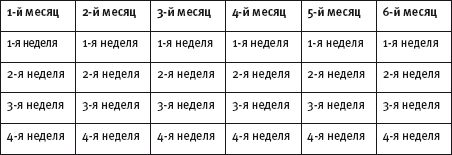 Еще один чистый лист понадобится вам для формирования графика работы. Прямо сейчас возьмите лист и нарисуйте двенадцать прямоугольников. Это месяцы года. В каждом месяце четыре недели – разделите и расчертите четыре недели, оформите визуально: полугодие, месяцы и недели отделите цветом.