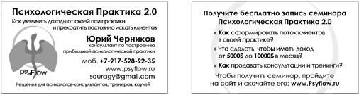 Мой телефон, сайт и почта. Дальше простой слоган: "Решение для психологов-консультантов, тренеров, коучей". А с обратной стороны – оффер, единственное, чего здесь нет, – дедлайна.