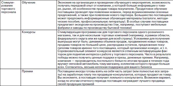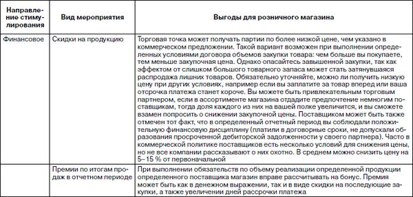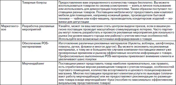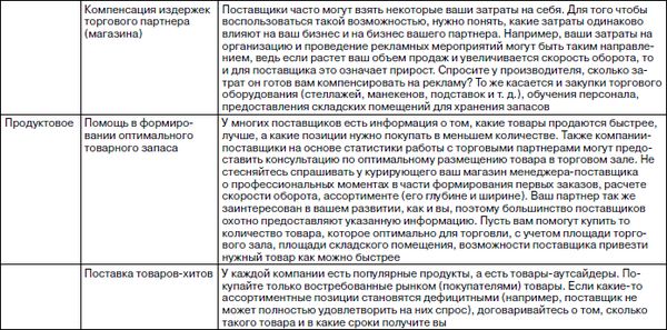 Не стоит забывать о том, что многие поставщики и производители предоставляют своим партнерам дополнительные бонусы, так называемое трейд-маркетинговое стимулирование. Для вас это возможность получить выгоду и снизить свои издержки. Практически у любой торговой или производственной компании есть разработанный план маркетинга с бюджетом на развитие своих торговых партнеров. К тому же часто именно благодаря поддержке поставщиков происходит более интенсивное развитие розничной компании. Помните об этом и всегда узнавайте, что кроме товара предлагает поставщик. Обязательно фиксируйте договоренности в письменном виде, например в дополнительном соглашении к договору. Помните, что партнерские отношения – это двусторонне выгодное сотрудничество, и если ваши поставщики настроены на постоянную работу, то должны расширить перечень поставляемых услуг. Вы же со своей стороны можете гарантировать определенные объемы реализации, лояльность к поставщику, выполнение договоренностей по оплате и т. д.