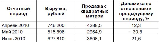 Продажи с квадратного метра необходимо мониторить для того, чтобы понимать, насколько эффективно используется торговая площадь. Разделите сумму выручки за отчетный период в рублях на площадь торгового зала в квадратных метрах. Площадь склада, парковки не учитывайте. Только торговую площадь. Например, вы арендуете торговый зал в 174 квадратных метра. За месяц вы продали на сумму 568 913 рублей. Значит, каждый метр приносит вам 3269,7 рубля в месяц. Кроме того, посчитайте цифры за все предыдущие отчетные периоды. Можно составить, например, такую таблицу (табл. 1.1).