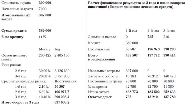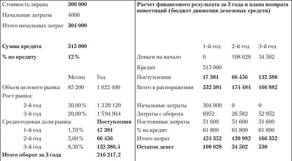 1. Возврат инвестиций обеспечивается за три года в том случае, если объем целевого рынка рекламы (наружки) составляет $410 000 месяц, что превышает объемы рекламного рынка нашего региона в 4,8 раза. Это объясняет, почему данный бизнес рентабелен в Москве, Питере и некоторых других экономически развитых регионах. Можно сделать вывод, что установка экранов во многих городах имеет смысл только в рамках долгосрочных инвестиционных проектов, предполагающих построение сети экранов по всей России. Разумеется, возможен альтернативный вариант финансирования – из бюджета. В этом случае рентабельность проекта не имеет значения.