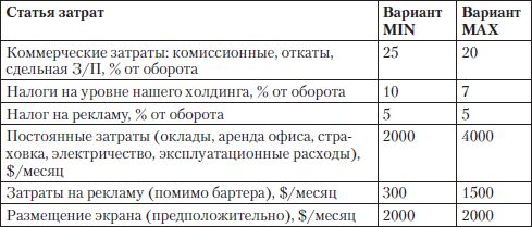 Начальные затраты, включая стоимость светодиодного экрана Мы определяем стоимость светодиодного экрана равной $300,000. Это один из переменных параметров, влияние которого на рентабельность бизнеса мы впоследствии будем анализировать. Кроме того, необходимы начальные затраты на организацию офиса: ремонт, отделка, обстановка, оборудование, коммуникации, вывеска и т. д. В варианте MIN эти затраты составят $4000, в варианте МАХ – $10 000.