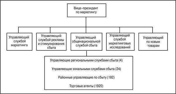 Организация по географическому принципу. В компаниях, торгующих по всей территории страны, подчиненность продавцов нередко приобретает форму организации по географическому принципу. В схеме на рис. 2.8 показаны: один управляющий общенациональной службой сбыта, четыре управляющих региональными службами сбыта, 24 управляющих зональными службами сбыта, 192 районных управляющих по сбыту и 1920 торговых агентов. При организации по географическому принципу торговые агенты могут жить в пределах обслуживаемых ими территорий, лучше узнавать своих клиентов и эффективно работать с минимальными издержками времени и средств на разъезды.