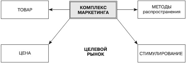 В комплекс маркетинга входит все, что фирма может предпринять для оказания воздействия на спрос своего товара. Многочисленные возможности можно объединить в четыре основные группы: товар, цена, методы распространения и стимулирования (рис. 9).