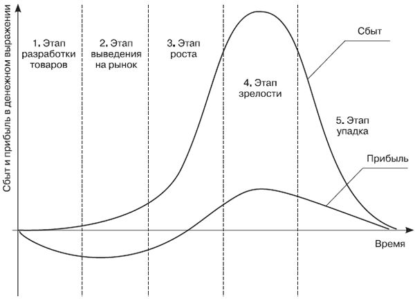 Товар обладает определенным жизненным циклом (ЖЦТ), под которым понимается время с момента начала разработки и выведения товара на рынок до его ухода с рынка. В классическом случае ЖЦТ включает пять этапов и выглядит, как показано на рис. 15, где наряду с кривой сбыта приводится кривая затрат/прибылей от разработки и реализации товара. Рассмотрим по порядку основные этапы ЖЦТ.