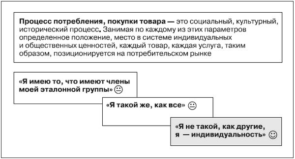 "Я не такой, как другие, я индивидуальность". В этом случае при выборе товаров и услуг человек смотрит по сторонам не для того, чтобы с кем-то конкурировать, а для того, чтобы через потребление сконструировать свой индивидуальный имидж. Однако это не всегда оказывается просто сделать, так как такая индивидуальность предлагается самым разным участникам рынка. В сегодняшних условиях потребления индивидуальность является понятием достаточно ограниченным.
