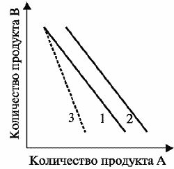 Каждой точке бюджетной линии соответствует набор товаров А и В, который потребитель может приобрести при данном доходе и ценах на товары. Любое изменение дохода или цен приводит к перемещению бюджетной линии. Если доход потребителя увеличивается, то бюджетная линия из положения 1 смещается в положение 2. Если снизится цена на товар А, то это приведет к перемещению конца бюджетной линии 1 в положение 3.
