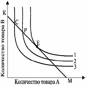 Точка пересечения (Е) называется точкой потребительского оптимума, так как расположена на наиболее высоко лежащей (из доступных потребителю) кривой безразличия (рис. 10).