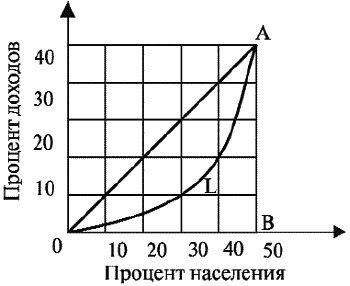 В уровне доходов существует дифференциация. Для ее определения используется кривая Лоренца (рис. 17).