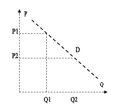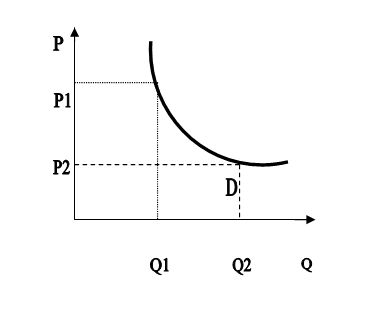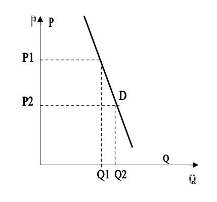 На оси абсцисс обозначены количество покупаемого на рынке товара (Q), а на оси ординат изменение цены товара (Р). В результате получена кривая (D), называемая кривой спроса. Проецируя на кривую спроса на цены, легко определить, как при этом изменится спрос. К примеру, при цене P1 спрос равен Q1. Если цена уменьшится до P2, то спрос возрастет до Q2. Таким образом, понижение цены способствует увеличению количества покупаемых товаров. Данная кривая иллюстрирует зависимость, называемую законом спроса. СНОСКА № 3.
