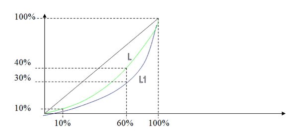 Прямая, соединяющая нулевую отметку и пересечение значений оси абсцисс и оси ординат со 100 % отметками, отображает состояние абсолютного равенства в распределении доходов. Если бы все семьи имели одинаковый уровень дохода, кривая имела бы вид прямой линии, отображенной черным цветом на нашем графике. Но в условиях рынка так не бывает, всегда есть неравенство в доходах. На рисунке зеленая линия отражает распределение дохода в США, а синяя - в Мексике. Как видно из данной схемы, распределение дохода в США ближе к линии абсолютного равенства, чем кривая распределения дохода в Мексике.