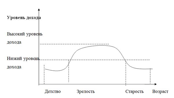 Соответственно рисункулюди будут распределять свой доход в момент наивысшего уровня доходности с целью создания определенных накоплений. Данные накопления создаются для того, чтобы при снижении уровня дохода расходы домохозяйства могли оставаться на прежнем уровне.
