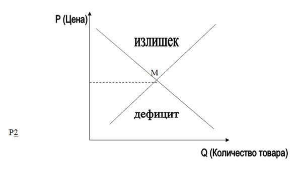 На рисунке 8 мы видим, что в точке пересечения кривой спроса и кривой предложения М (в точке равновесия) объем спроса равен объему предложения (равновесный объем), а цена спроса равна цене предложения (равновесная цена). Сущность рыночного равновесия заключается в том, что в этом состоянии рынок сбалансирован: ни продавцы, ни покупатели не стремятся нарушить это равновесие, в этой точке их интересы совпадают.