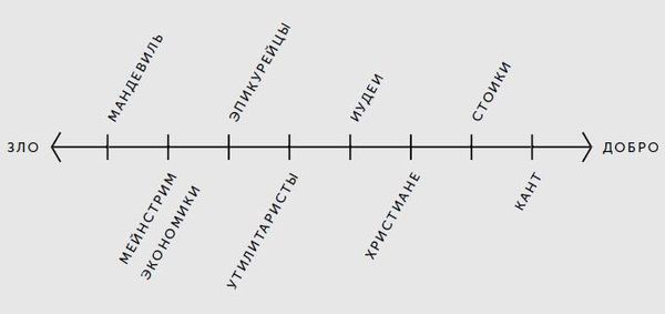 В процессе нашего исторического паломничества мы периодически встречались с кардинальным вопросом: выгодно ли делать добро? Является ли "экономическим" хорошее поведение, и следует ли из него некое воздаяние или экономическая выгода? Итак, начнем с краткого обобщения главных философских школ, нравственные учения которых занимались "экономикой" добра и зла. Между ними поместим и современный экономический мейнстрим. Мы пойдем по самой границе допустимого упрощения и для наглядности разместим отдельные доктрины на воображаемой оси в соответствии с их отношением к выгодности добра. Постепенно мы будем продвигаться от течений мысли, в которых нравственность максимально отделена от выгоды и отношение к экономике добра и зла наиболее скептическое, в направлении концепций, ставящих между нравственностью и выгодой знак равенства.