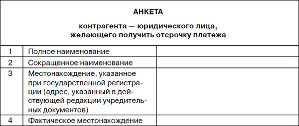Анкета клиента – юридического лица, желающего получить отсрочку платежа, может выглядеть следующим образом (табл. 2.2).