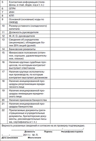 В некоторых случаях можно обойтись и без заполнения клиентом анкеты, однако заполненная и подписанная со стороны клиента анкета может быть очень полезна в случае, если в дальнейшем долг будет взыскать невозможно по причине плохого финансового положения клиента либо нахождения в процессе ликвидации или банкротства на момент заключения сделки. В подобной ситуации анкета, в которой контрагент охарактеризовал свое финансовое положение как хорошее и указал отсутствие процедур реорганизации, ликвидации и банкротства, может быть использована как доказательство вины клиента при обращении кредитора в правоохранительные органы с целью возбуждения в отношении клиента-должника уголовного дела по факту мошенничества (статья 159 Уголовного кодекса РФ) либо по факту причинения имущественного ущерба путем обмана или злоупотребления доверием (статья 165 Уголовного кодекса РФ).