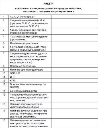 Анкета клиента – индивидуального предпринимателя, желающего получить отсрочку платежа может, выглядеть следующим образом (табл. 2.3).