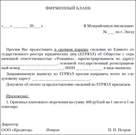 В соответствии с указанными документами для получения необходимой информации о том или ином юридическом лице либо индивидуальном предпринимателе требуется направить в адрес налогового органа, его зарегистрировавшего, письменный запрос в произвольной форме. В запросе должна содержаться информация, достаточная для индивидуализации лица, осуществляющего запрос, а также лица, в отношении которого запрашивается информация из государственного реестра. К письменному запросу необходимо приложить документ об оплате. На весну 2011 г. размер платы за предоставление информации из ЕГРЮА и ЕГРИП составляет при обычном порядке предоставления 200 рублей за каждый такой документ, при срочном предоставлении информации – 400 рублей за каждый документ.
