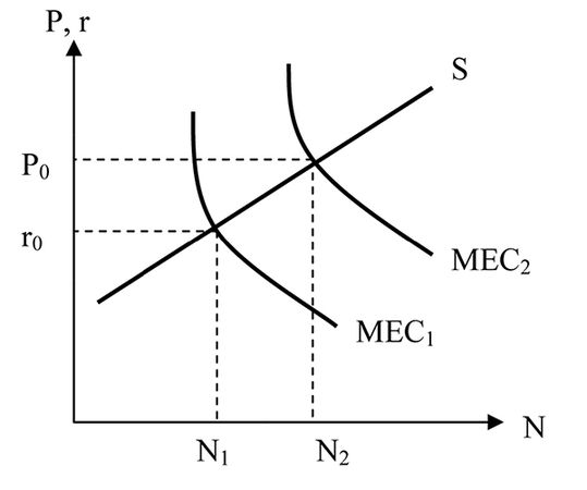 Из сказанного следует, что под МЕС следует понимать как ожидаемый доход от прямых производственных инвестиций, который превышает норму процента, иначе предприниматель мог бы ограничиться процентом по банковскому вкладу. Нижеприводимый рисунок показывает различие между нормой процента и ожидаемой прибылью и то, как это различие сказывается на уровне производства и занятости.